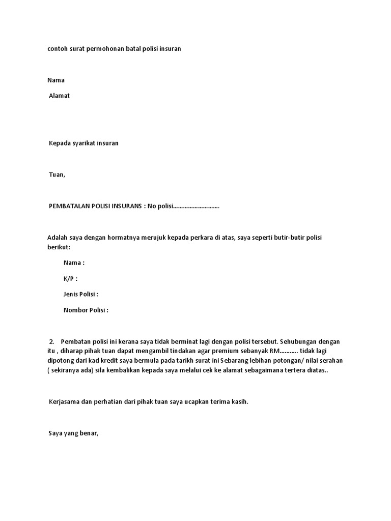 Contoh Surat Permohonan Batal Polisi Insuran Pdf